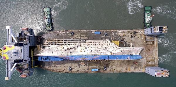 Uluslararası ajansların bugün geçtiği fotoğraflarda, 6 bin 325 ton ağırlığındaki dev feribotun Mokpo limanına getirildiği görülüyor. Sewol gemisini deniz üzerine kurulan özel sistem taşıdı, kıyıda çok sayıda insan karşıladı.