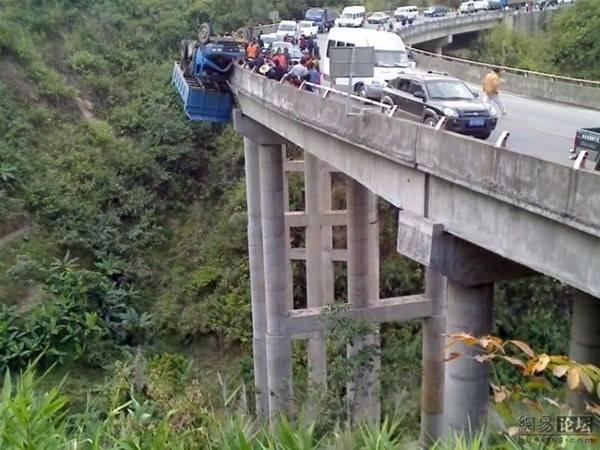 Aracın kontrolünü kaybeden kamyon şoförü 60 metre yükseklikte asılı kaldı.