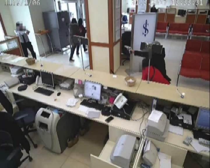 Bu sırada çevredeki diğer müşteriler dışarı kaçarken bankanın güvenlik görevlisi S.P. de silahını çıkarıp soyguncuya yöneltiyor.