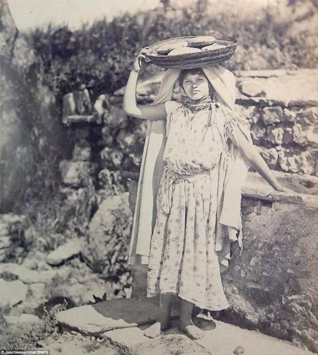 Başında bir sepet içinde ekmek taşıyan bir kadın...