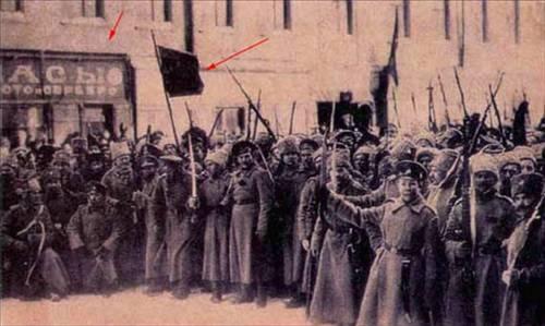 Devrim zamanlarında çekilen bu fotoğrafta halkın elinde kızıl bayraklar yer alıyor. Arkada da değerli saatler satan bir kuyumcunun tabelası görünüyor.