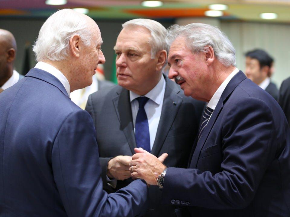 BM Suriye Özel Temsilcisi Staffan de Mistura (solda), Frans Dışişleri Bakanı Jean-Marc Ayrault (ortada), Lüksemburg Dışişleri Bakanı Jan-Asselborn (sağda)
