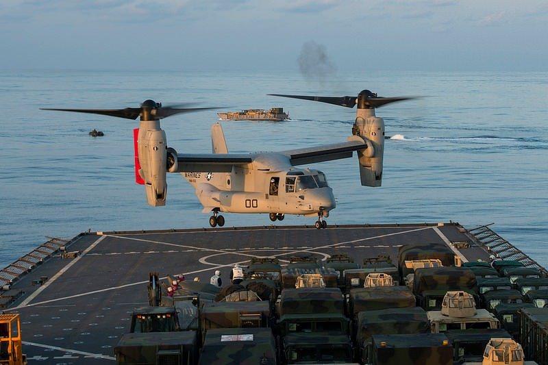 V-22 Osprey helikopteri USS Ashland savaş gemisine inerken.