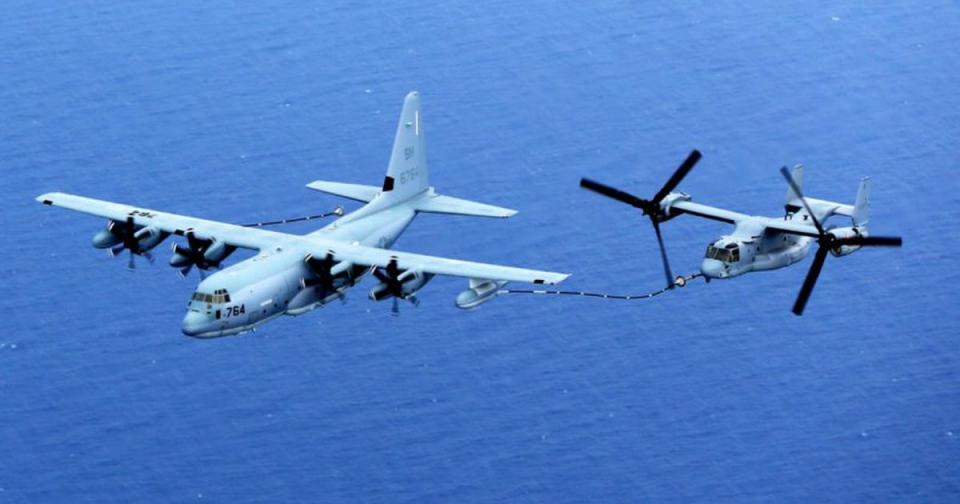 Amerikan Hava Tankeri KC-130J Hercules, MV-22 Osprey'e yakıt yüklerken.