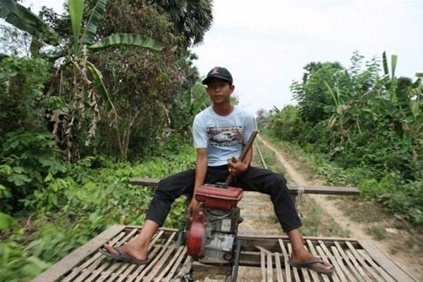 Raylarda yol alabilmek için özel bir dizel motor ve derme çatma bir makina icat eden Kamboçyalılar, iki şehir arasında hizmet veriyor.