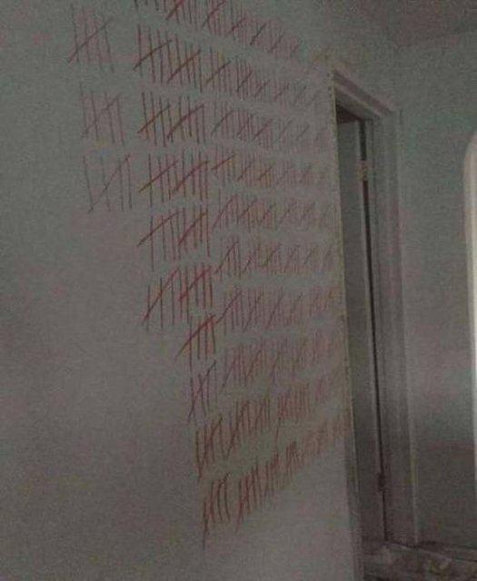 Duvarlarda hapishanelerdekine benzer yüzlerce kırmızı çizgi gördüler. Ardından duvarlardaki yazıları fark ettiler.