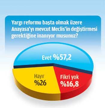 Anket sonuçlarına göre, halkta yargının siyasallaştığı ve kararlarında hukukun dışına çıktığı görüşü hakim. Tüm katılımcıların yüzde 67'si bu görüşü savunurken, yüzde 16,8'i buna karşı çıktı. "Ülkemizde yargı bağımsızlığı problemi var mıdır?" sorusunun cevapları da benzer oranları ortaya koydu: Yüzde 70,2 'evet', yüzde 16,8 'hayır', yüzde 13 'fikri yok'.