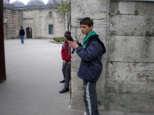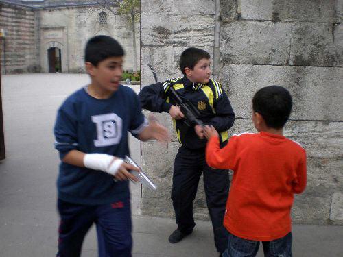 Şiddet içerikli diziler ve bilgisayar oyunlarından etkilenen çocuklar, hayranı oldukları karakterleri sokakta canlandırıyor. Fatih'te arka sokaklarda toplanan çocuklar, gerçeğine bire bir benzeyen otomatik tüfekler ve uzun namlulu silahlar ile birbirlerine boncuk atıyor. (CİHAN/Hüseyin Aydın)