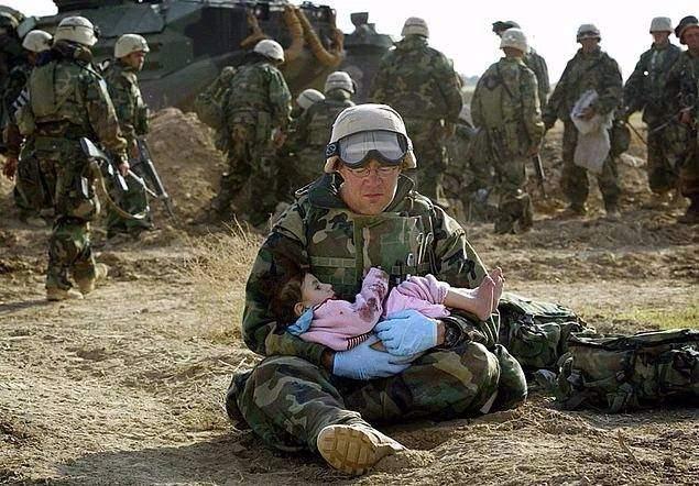 Yine Irak İşgali sırasında bir asker, az önceki çatışma sonrasında ailesini kaybeden küçük bir çocuğu yanına almış. (2003)