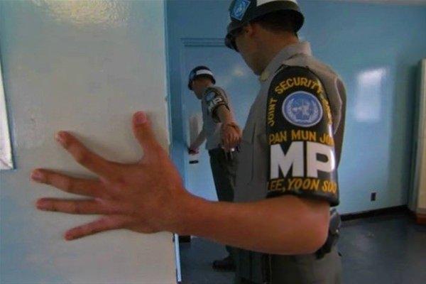 İki Güney Kore askeri tarafsız bölgedeki kapının önünde. Askerler Kuzey Kore tarafına çekilme ihtimaline karşı el ele tutuşuyor.
