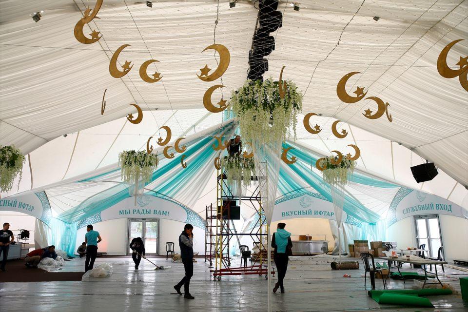 Rusya'nın başkenti Moskova'da yaşayan Müslümanlar, ramazan hazırlıklarını tamamlamaya çalışıyor. İlk orucun yarın açılacağı iftar çadırının hazırlıklarında da son aşamaya gelindi.