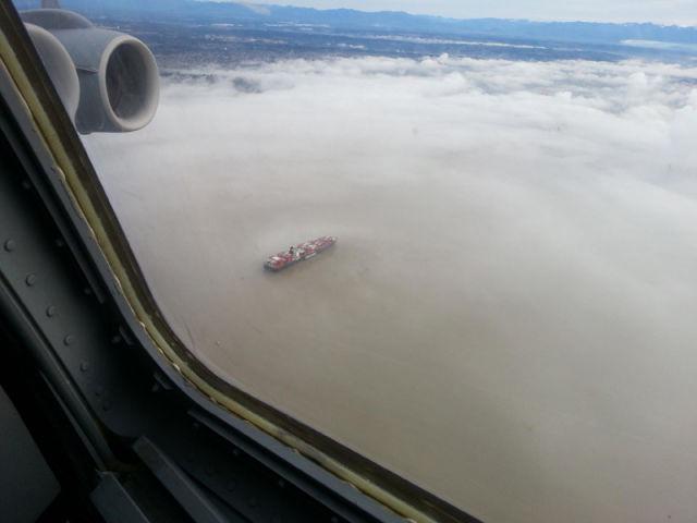 Bulutlar üstünde giden bir gemi gibi görünüyor ama aslında deniz üstünde sis tabakası