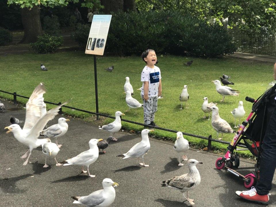 Martılar arasında kalan çaresiz çocuk.