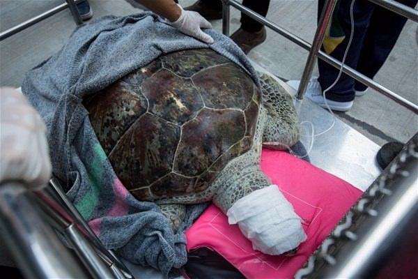 Madeni paralar sebebiyle çeşitli hastalıklara yakalanan kaplumbağa Veteriner Nantarika Chansue ve ekibi tarafından ameliyat edildi.