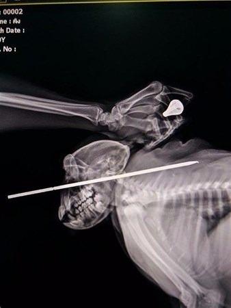 Sonunda maymunu yakalamayı başaran kadın hemen veterinere götürdü. Zıpkın oku maymunun kafatasına zarar vermiş ancak beynini sıyırmıştı.