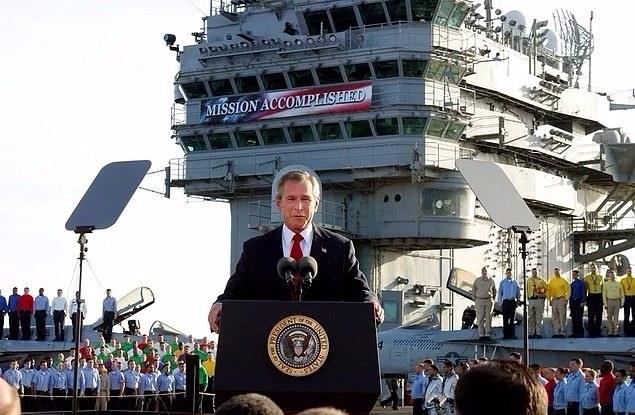 Başkan Bush'un savaştan 42 gün sonra bir uçak gemisinin önünde yaptığı ve ünlü 'görev tamamlandı' yazısının olduğu konuşması (2003)