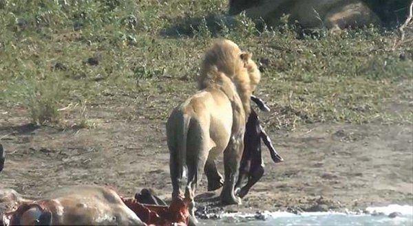 Aslanların ikisi karnını doyurduktan sonra dinlenirken üçüncü mandanın içindeki cenini fark etti.