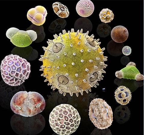 Polenlerin ebatları çok farklıdır. Ortadaki balkabağı poleninin çapı yaklaşık 0.2 mm. Milimetrenin onbinlerce biri ebatında polenler de var.