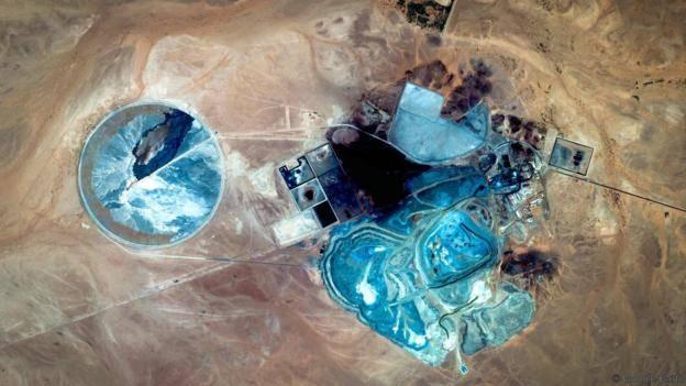 Moritanya’daki bir bakır ve altın madenini gösteren bu fotoğraftaki mavi renk bakır tabakalarının oksitlenmesi sonucu oluşmuş. Bakır havanın içindeki oksijen ve su ile temas ettiğinde yüzeyde bakır karbonat oluşturarak mavimsi yeşil bir renk veriyor.