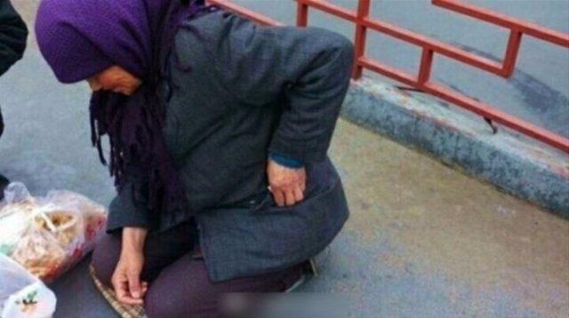 Yanına yaklaşan bir kadın, dilenciye içi yiyecek dolu bir poşet veriyor.