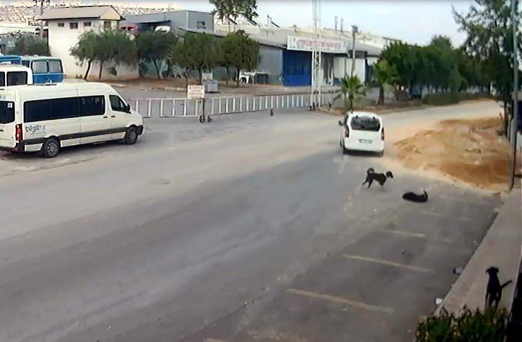 Bu köpek kaçarak ezilmekten kurtulurken, diğer bir köpek aracın peşinde koşmaya başlıyor.