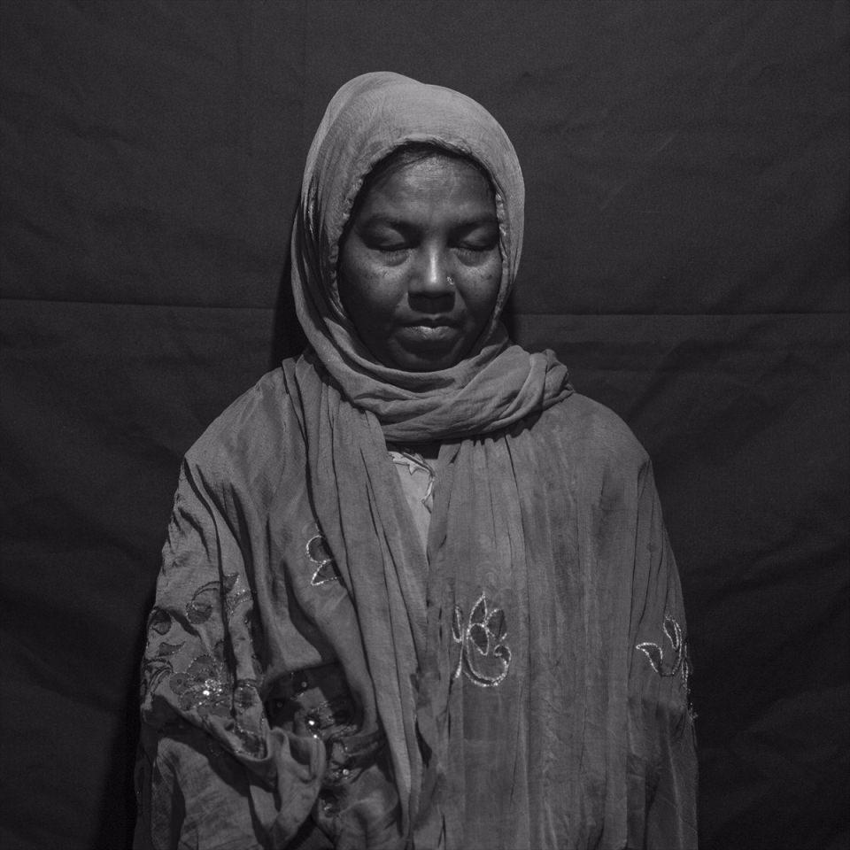 Hindistan'a gelmeden önce yaşadığı Buthidaung Kasabası'nda eşini kaybeden 45 yaşındaki Amina da (fotoğrafta), Myanmar'daki şiddetten kaçanlardan biri ve dünyanın onları görmezden geldiğini anlatabilmek adına o da dünyaya gözlerini kapatarak poz veriyor.