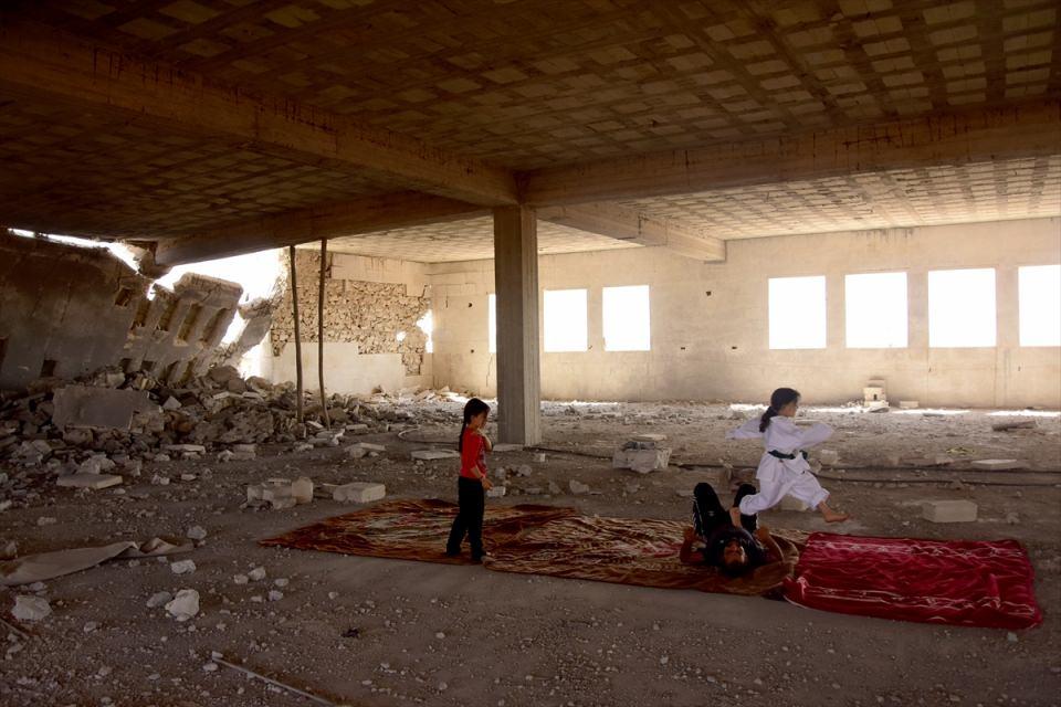 AA muhabirine konuşan 6,5 yaşındaki Nur, Halep'te bombardımanlar durduğunda babasıyla içinde hiçbir şey bulunmayan spor salonuna gittiklerini ancak saldırı zamanlarında evde anne ve babasıyla çalıştıklarını söyledi.