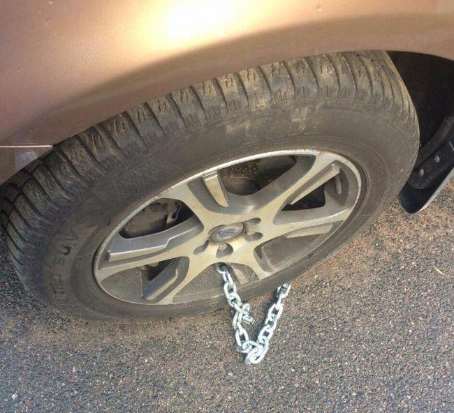 Arabasının lastiği bir zincir ile kilitlenmişti ve ne yapacağını bilemedi.