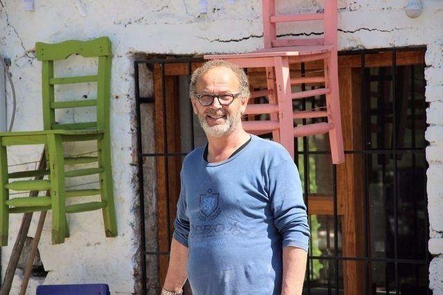 Bodrum'da yeşil, mavi, turuncu, beyaz ve sarı renkte sandalye imal eden Yeşilmçam'ın ünlü oyuncusu Gümüşlük mahallesi Dere köyde açtığı marangoz atölyesinde tahta sandalye imalatı yapıyor.