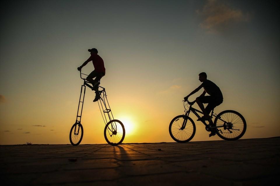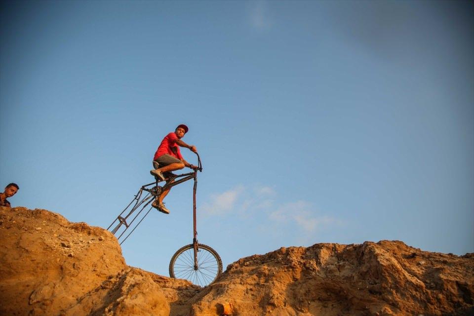 Gazze'de yaşayan 24 yaşındaki Filistinli Alaa Saeedy, kendi imkanlarıyla ürettiği yaklaşık 2 metre yüksekliğindeki bisiklet ile kent içindeki ulaşımını sağlıyor.