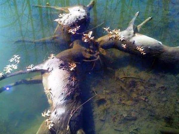 Kavga esnasında boynuzları sıkışınca göle düşen üç geyiğin trajik sonu.
