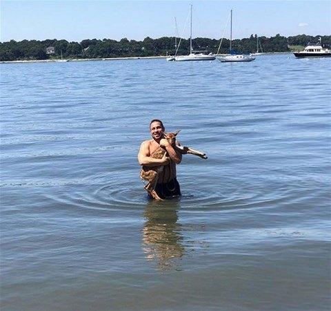 Ağzıyla denizden sürükleyerek çıkardığı yavru geyiği ardından yalayarak sıcak tutmaya ve onu rahatlatmaya çalışıyor. Ama geyik yeniden kaçıp suya atlıyor. Bu sefer de sahibi geyiği kurtarmak için suya giriyor ve geyik bir kez daha kurtarılıyor.