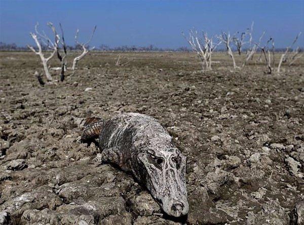 Bu Güney Amerika timsahının kuruyan leşi Pilcomayo Nehrinin kıyısında duruyor. Boqueron, Paraguay.