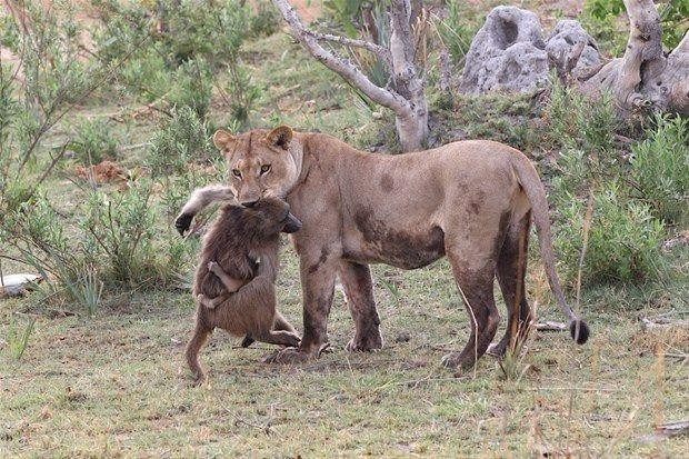 Aslan öldürdüğü dişi babunun yavrusu olduğu fark edince olan oluyor.