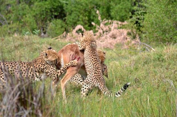 Yavrularına avlanmayı öğreten anne, yavrularıyla birlikte bir ceylanı sıkıştırıyor.