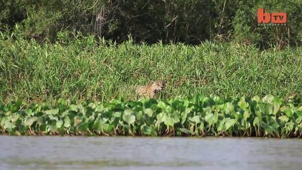 Yakaladığı timsahı ağzıyla sıkıca tutan jaguar, daha sonra avını kıyıya çıkardı.
