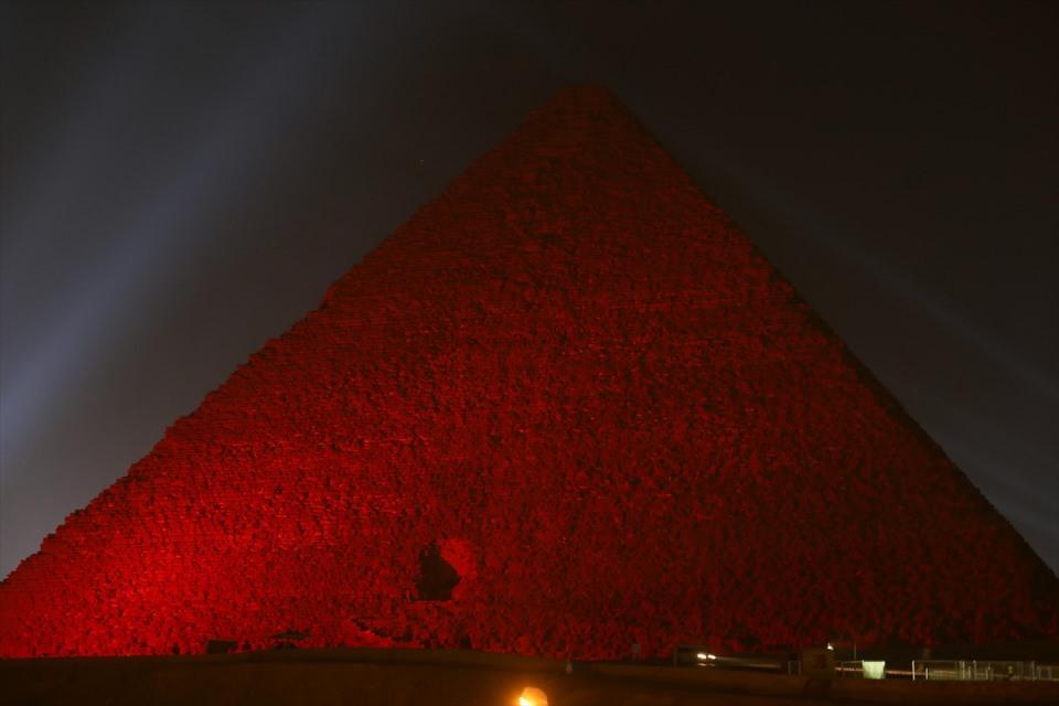 Dünya Kalp Günü dolaysıyla Mısır'ın Giza'daki piramitleri kırmızı ışıkla aydınlatıldı.