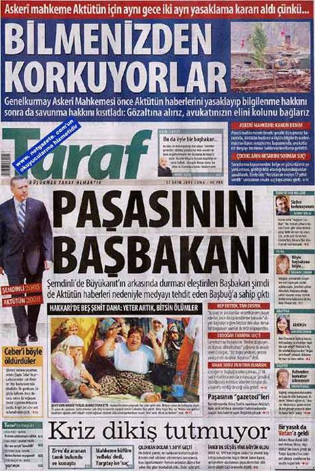 Aktütün sınır karakolunda 15 askerimizi şehit verdiğimiz hain saldırı sonrasında Genelkurmay Başkanı İlker Başbuğ'a medya kanalıyla yapılan eleştirilere tepki gösteren Başbakan Erdoğan için de 17 Ekim 2008 tarihli sayısında "Paşasının Başbakanı" atmıştı. Erdoğan da Taraf'a sert tepki göstermişti.