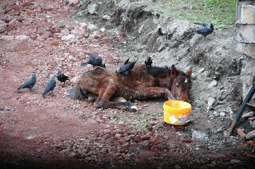 Halsiz düşen hayvanın üzerine çıkan kargalar derisini didip, tüylerini yolmaya başladı.