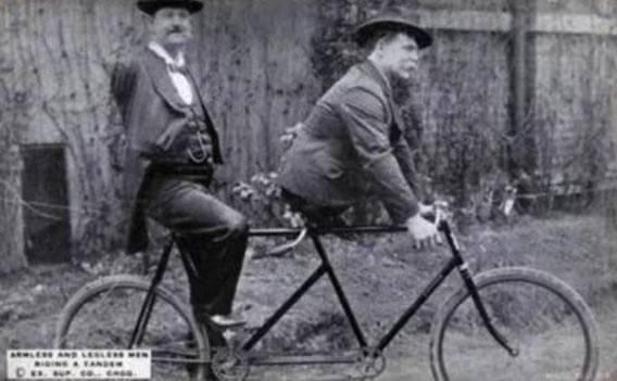 Bacakları olmayan ve kolları olmayan iki adam. Tek vücut halinde bisiklet sürüyor.