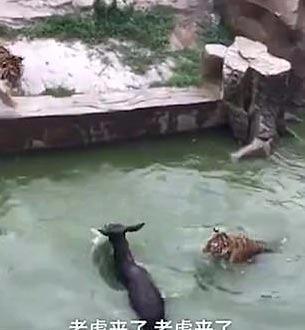 Hayvanat bahçesindeki kaplanların olduğu bölüme canlı eşek atan yetkililerin görüntüleri skandala neden oldu.