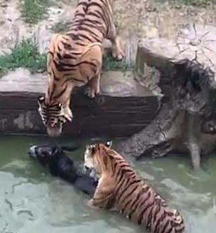 Hayvanat bahçesi çalışanları, eşeği atar atmaz kaplanlar etrafını sarıyor.