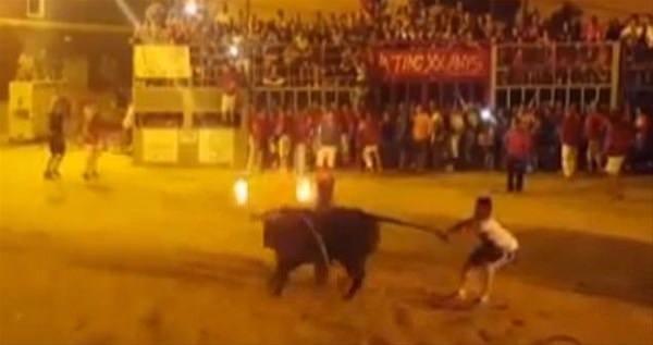 İspanya'da düzenlenen boğa festivalinde, yürek burkan bir olay yaşandı. Valencia kentindeki organizasyonda çalışanlar, boğanın boynuzlarına bant ile meşale yapıştırınca boğa telaş içinde koşturmaya başladı.