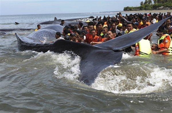Endonezya’nın Açe bölgesinde karaya vuran 10 balinadan dördü hayatını kaybetti.