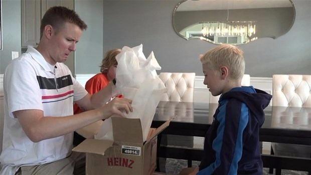 Ebay üzerinden aldığı eşek arısı kovanını masanın üzerinde testereyle kesen adam, çocuklarının şaşkın ifadeleriyle birlikte kovanı tam ortasından ikiye kesiyor.