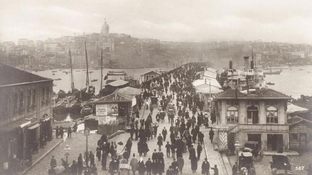 Ahşap Galata Köprüsü'ne Eminönü'nden bakış (1900'lü yılların başı)