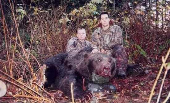 2001 yılının Ekim ayında Alaska’da çekilen bu fotoğrafta, Amerikalı pilot Ted Winnen tarafından vurulan boz ayı görülüyor. Winnen ayının kendisine saldırdığını ve kendini korumak için vurduğunu söylüyor. Bu boz ayı 3.2 m uzunluğunda ve yaklaşık 500 kg ağırlığındadır.