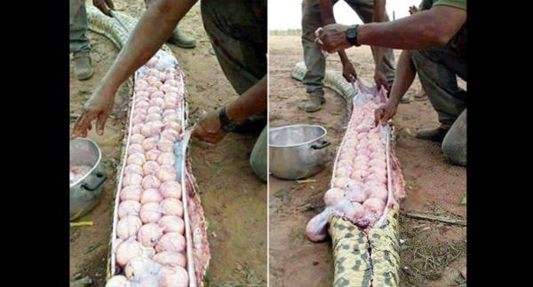 Köylüler, sürüngeni öldürüldükten sonra 'lezzetli' olarak niteledikleri yumurtaları hamile yılanın karnından tek tek çıkardı. Yılanın hangi türe ait olduğu net ifade edilmese de bir yılanın yüze kadar yumurta üretebileceği belirtildi. Sürüngenin ebatlarına bakıldığında ilk başta 'anakonda' gibi görünse de adı geçen yılanın sadece Güney Amerika'da yaşadığı biliniyor. Uzmanlar yılanın türünün 'Afrika kaya pitonu' olabileceğini açıkladı.