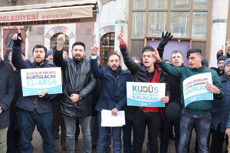 Yozgat'ta TÜGVA Amerika'nın Kudüs'ü İsrail'in başkenti olarak tanıma planına tepki gösterdi. TÜGVA öncülüğünde Çapanoğlu Büyük Camisi önünde toplanan vatandaşlar Amerika ve İsrail'i protesto etti.