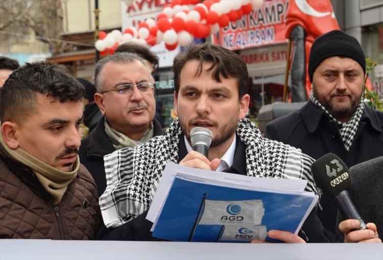 Kütahya’da, Anadolu Gençlik Derneği (AGD) öncülüğünde, ABD'nin Tel Aviv'deki büyükelçiliğini Kudüs'e taşıma girişimine tepki göstermek amacıyla eylem düzenlendi. AGD Kütahya Şube Başkanı Erol Taşkın (ortada) burada bir açıklama yaptı.